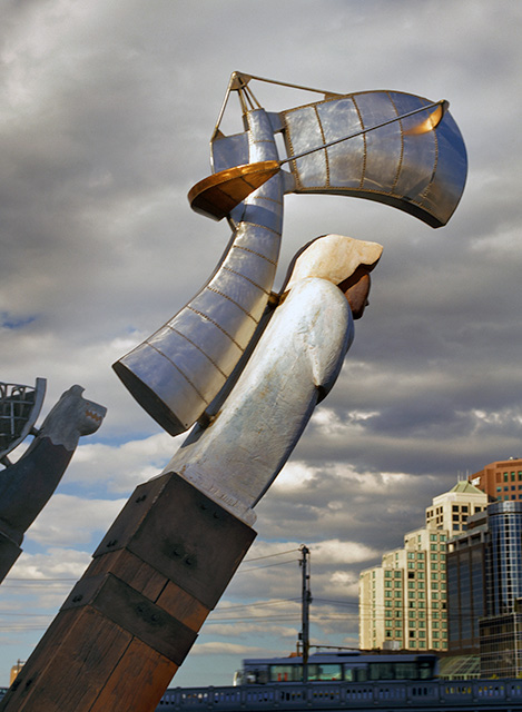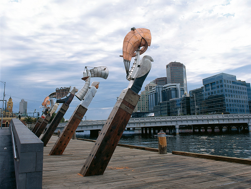 This public commission, on the bank of the Yarra River, captures the natural suggestions of clouds, the billowing of sails, rigging, the movement of wind vanes and the associations of ships' figureheads. In this large work, his first ever sculptural collaboration, Bartlett's jutting copper and stainless steel forms seem ever ready to pivot and point in their maritime location. The group of five angled sculptures splay outward from a central column which displays the prow of a boat, the only symmetrical piece in the group. Both the outermost elements curve inward as though to bookend the thematically related arrangement, thus concentrating visual attention inwards upon the central boat form, itself a hint of the marine connections stipulated in the commission brief. All of this, once again, is done in ways which successfully lInk the mechanical with the natural and marry the sea with the land.