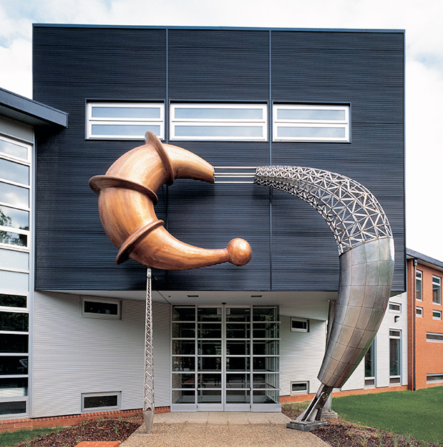 This technique is present in Fusion 2000, a large scale commission recently completed for the Australian National University. Bartlett has exposed the top and bottom sections of the enormous curved truss, whilst cladding the lower central section in spot welded metal, creating a striking solid object with the strength to stand out among the visual complexities of the lower floor of the building. Fusion exemplifies the sense of balance and tension inherent in Bartlett's work, with disparate objects and materials permanently suspended in a seemingly paradoxical struggle to maintain their ground over opposing elements.